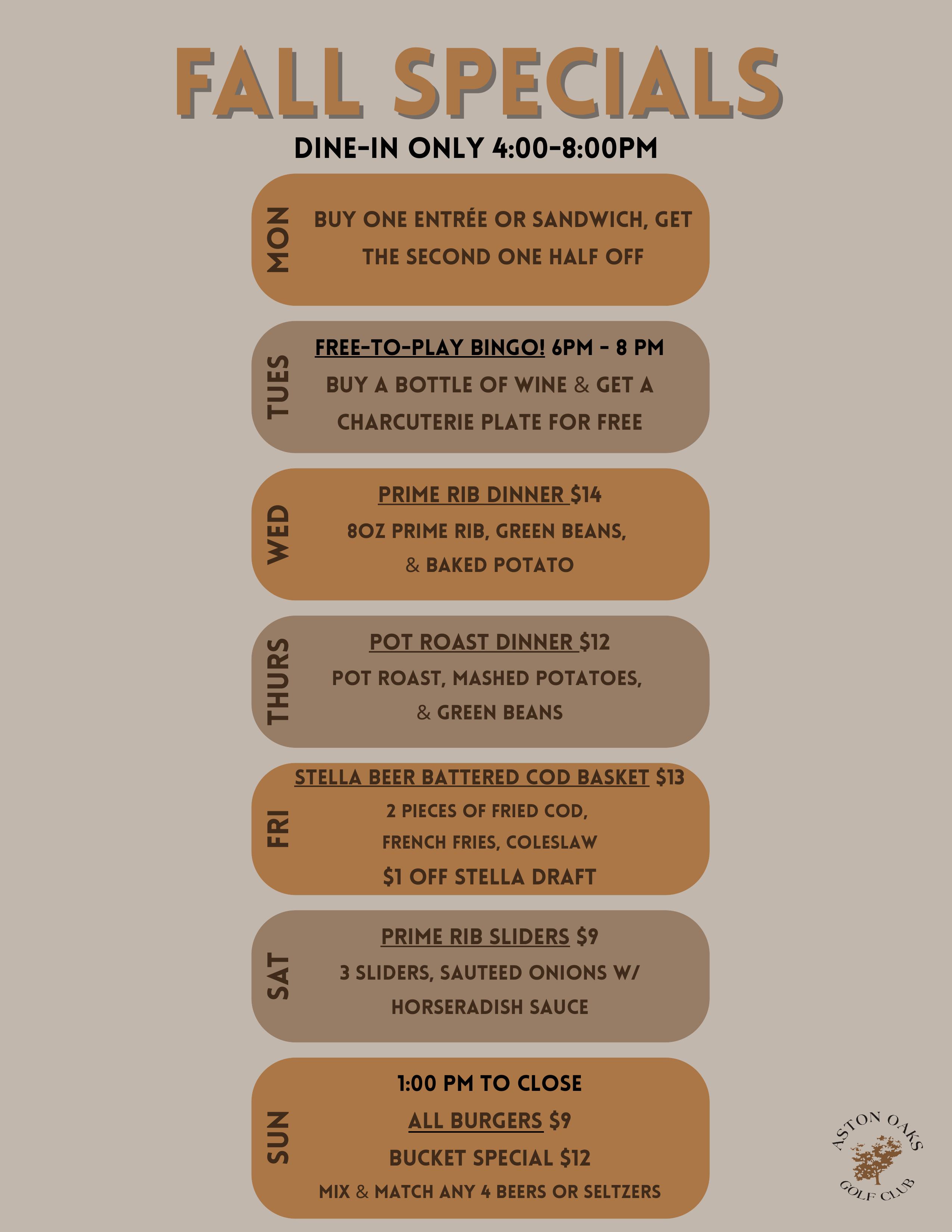 The OakLeaf Restaurant has an extensive American menu that offers a variety of delicious appetizers, sandwiches, and entrees. The charming dining room, bar area, and covered patio that overlooks the scenic 9th fairway is open to the public 7 days a week for lunch and dinner. The OakLeaf is family friendly and accepts reservations. Large parties are always welcome, and catering or carryout is just a phone call away: (513) 467-0070 ext. 3. Download our menus below.